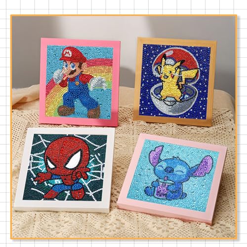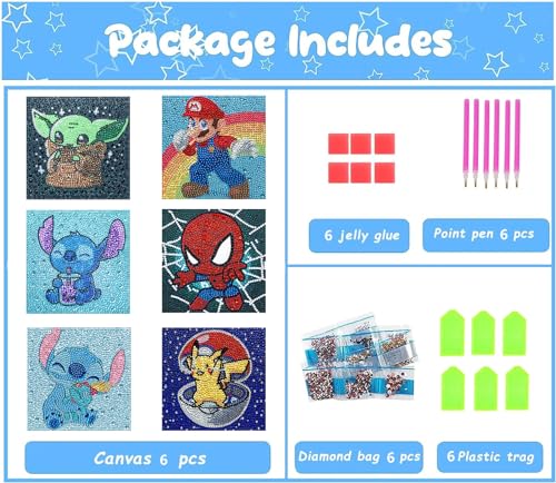 【Quality Material】: diamond art kits for kids all with high HD printed oil canvas, diamond painting kids for kits has everything you need,6* HD printed canvas,6* diamond pen, 6* glue,6* tray, enough round diamonds so there is no need to purchase any other paint by diamond dots art kits,you can DIY your art & crafts by yourself, parents also can work with them to finish the creation(frame not including), you will create 6 different pattern paintings.