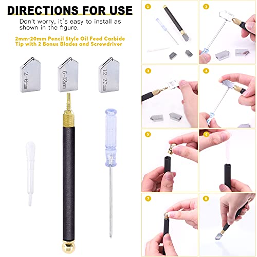 【Upgrade Pencil Style Oil Feed Glass Tool】Anti-skid durable aluminium alloy handle for comfortable holding and labor saving. Featured with automatic oil dispensing system,keeping the wheel lubricated and sharp.. Ultra-strong diamond carbide blade with solid hardness and sharp cutting to guarantee smooth operation. Ergonomic design allows you to add pressure to the glass without damage. Suitable for 2-6/6-12/12-20mm thick glass cutting.