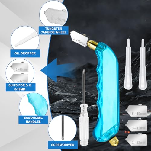 【Oil Feed Glass Cutter Set】Features automatic oil dispensing system keep the wheel lubrication while you cut. 3 Glass cutter heads are suitable for cutting glass of 2-6mm, 6-12mm, 12-20mm thickness respectively.