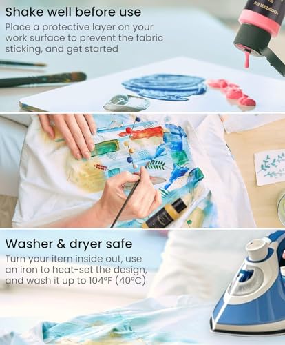 【No Heating Needed & Machine Washable Fabric Paint】 Owe to the special formulation, the fabric paints for clothing are designed to be cured at ambient conditions with no heating needed. The textile paints can dry quickly & stay as beautiful on the day they were painted. Once dry, they become waterproof & WASHABLE in washing machine. Therefore, our silk fabric paint set turns your clothing, shoes, tshirts, denim with finished decorating cloth art into permanent craft art pieces & sweet memory.