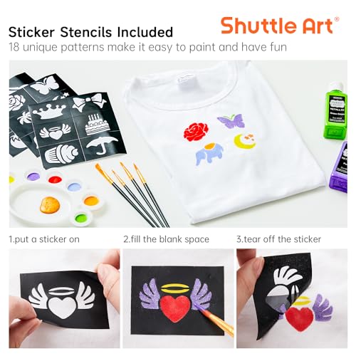 30 VIBRANT COLORS WITH STENCILS : Shuttle Art fabric paint set contains 30 colors soft fabric paint in bottles (60 ml/2 oz), 6 brushes, 1 palette and 18 patterns sticker stencils, perfect for various textile paintings and art crafts
