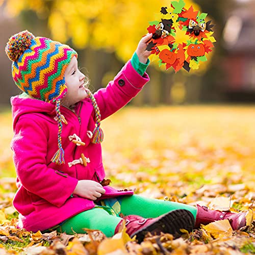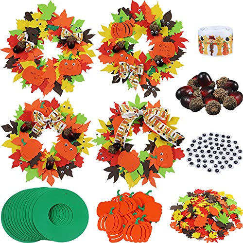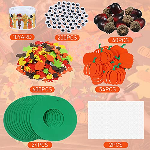 Sufficient quantity: you will receive 24 sets of pumpkin fall leaf craft wreath kits, including 24 green circles, 600 leaves in 15 sheets, 1 pumpkin stem, 200 plastic wiggle eyes, 2 sheets of double sided adhesive dots, 54 pumpkin foam crafts in 3 sheets, 10 yards fall ribbons and 40 imitation acorns, which are enough for you to create your own design