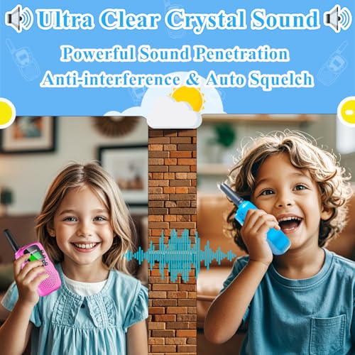 Clear Sound Quality & Automatic Squelch – The automatic noise reduction technology and adjustable volume function of these kids walkie talkies ensure crystal-clear sound transmission, ensuring every message is heard loud and clear, enhancing the communication experience
