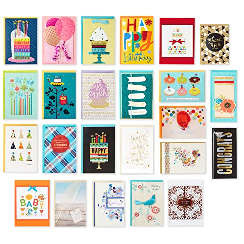 This set includes 14 birthday cards; 2 blank cards, thinking of you cards, and sympathy cards; and 1 baby card, wedding card, thank you card, and congrats card. Card size varies, extra postage may be required.