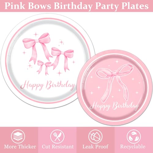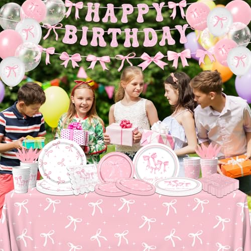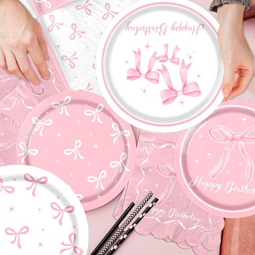 Pink Bow Birthday Party Supplies Serve 24, Coquette Birthday Decorations Include Bow Plates Napkins Cups Banner Tablecloth Cake Topper Balloons Bow Theme Tableware for Girls Bachelorette Decor
