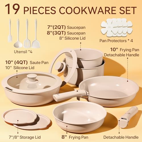 CAROTE Ceramic Cookware Sets, Pots and Pans Set Non Stick Non Toxic, Induction Cookware, Kitchen Cookware Sets, Pots Set for Healthy Coooking 19Pcs, Taupe