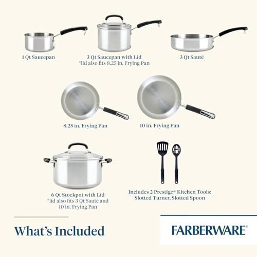 Farberware Brilliance Stainless Steel Cookware Pots and Pans Set with Kitchen Cooking Tools and Glass Lids, 10 Piece, Dishwasher Safe and Induction Ready, Stainless Steel