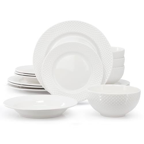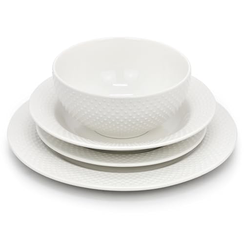 Elegant Presentation: The refined embossed pattern and white finish enhance the presentation of your favorite dishes, elevating any meal and making a classic set feel special.
