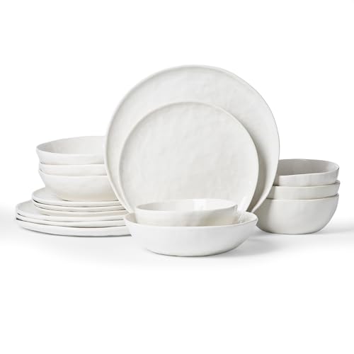 Famiware Porcelain kitchen plates and bowls set, Modern dishes set for 4, Handmade Wave Edge Dinnerware Sets, Microwave and Dishwasher Safe Tableware, Polar White (16pc)