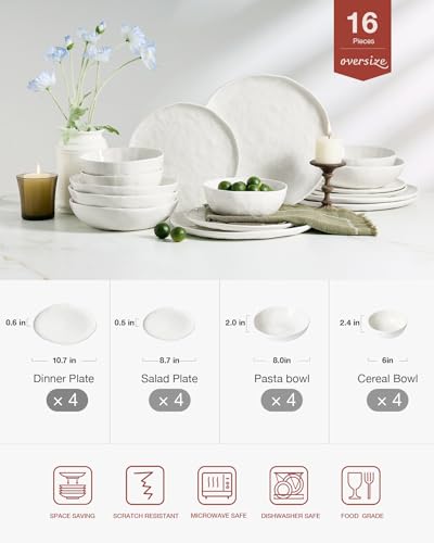 【What Will You Receive】Ideal for large families, couples, or individuals, 16 pieces white dishware set includes: 4 x 10.7″ Large dinner plates, 4 x 8.7″ salad plates, 4 x 8″ Pasta bowl and 4 x 6″ cereal bowls, perfect for daily meals, gatherings, and special occasions.