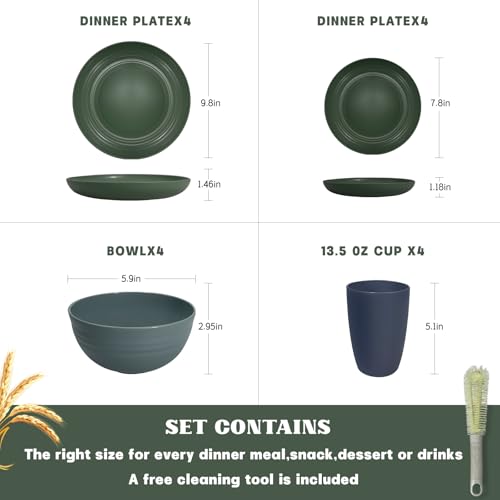 Kitchen Wheat Straw Dinnerware Sets (17pcs) Attached cleaning brush,Service For 4,Plastic Plates and Bowls Sets,Unbreakable Dinnerware,Lightweight Plastic Plate Set (four-colour)