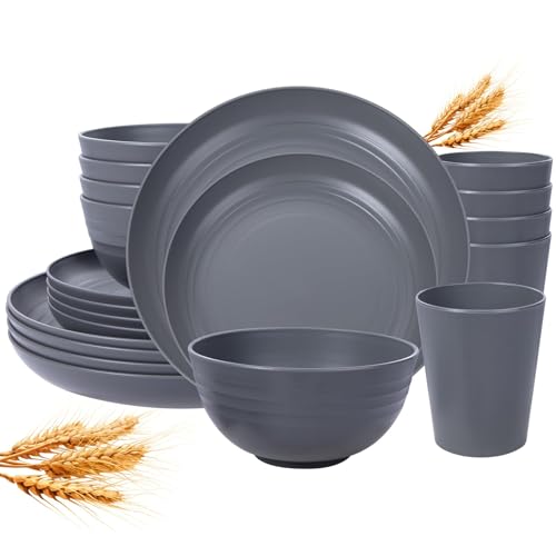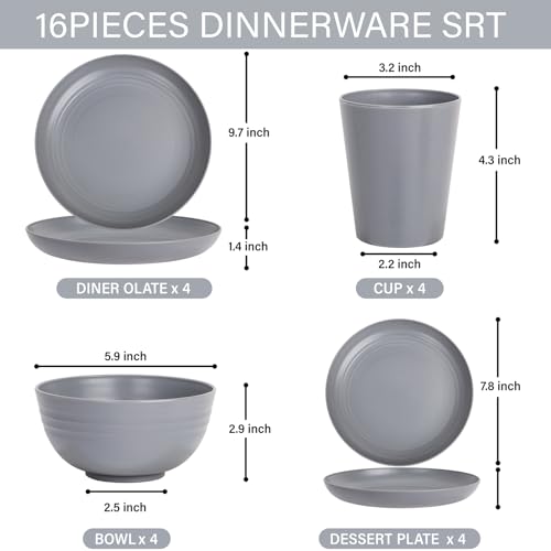 LIYH 16 Pcs Grey Wheat Straw Dinnerware Sets Unbreakable Dinnerware Sets for 4 Plates and Bowls Set Plastic Plates Reusable Straw Tableware Dish Set for 4 Include Plate Bowl Cup