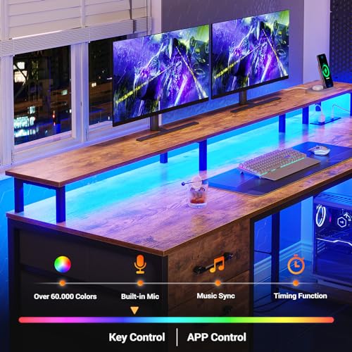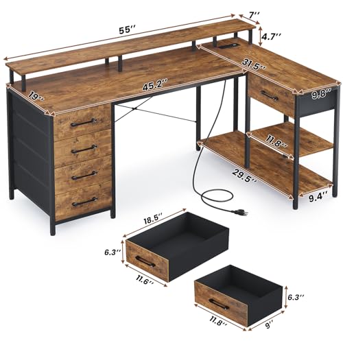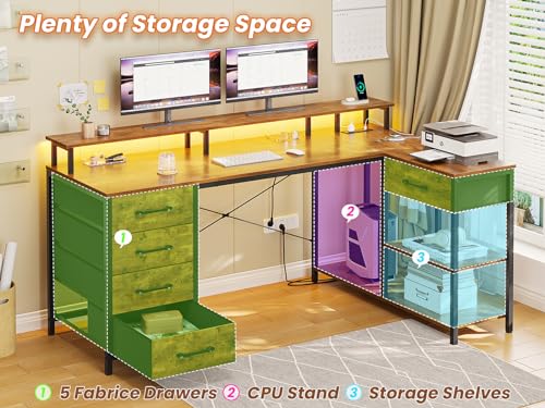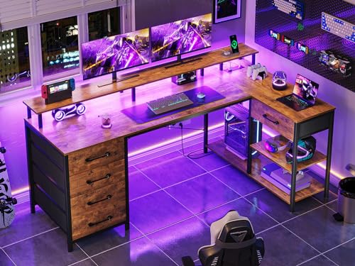 SEDETA L Shaped Desk with 5 Drawers, L Shaped Gaming Desk with LED Lights & Power Outlets, Computer Desk with Shelves & Drawer, Corner Desk Home Office Desk, Rustic Brown