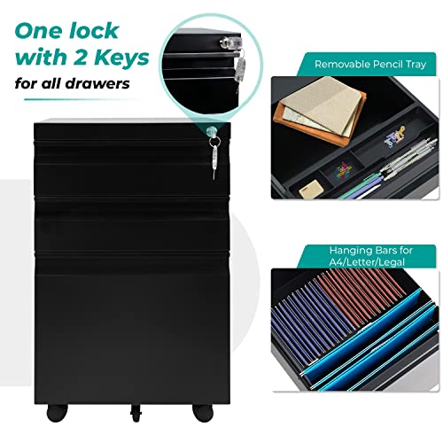INTERGREAT 3 Drawer Rolling File Cabinet with Lock, Assembled Metal Filing Cabinet for Home Office, Under Desk Office File Cabinets with Wheels for Legal/Letter/A4 File, Fully Assembled, Black