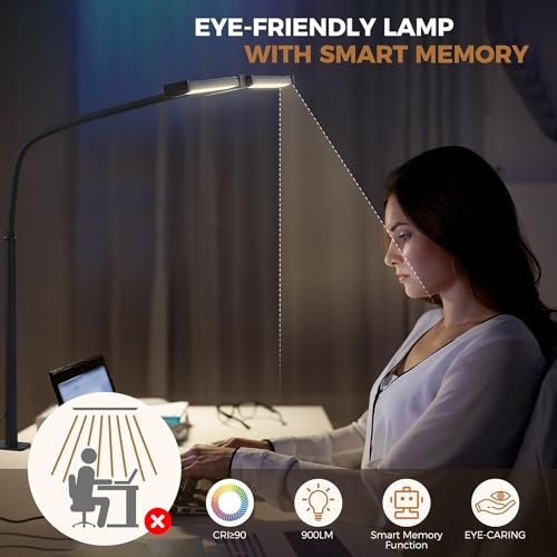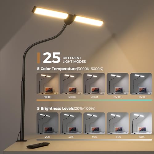 【Multiple Brightness Modes & Smart Memory Function】 This double-head desktop light offers 5 color temperatures (3000K-6500K) and 5 dimmable brightness modes (20%-100%). Additionally, it features a smart memory function, retaining the previous mode when turned on again, providing convenience in use.
