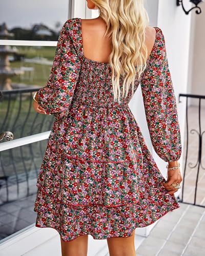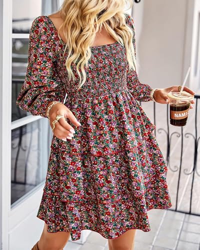 BTFBM Womens Long Sleeve Dress Vacation Square Neck Smocked Floral Swiss Dot Mini Boho Fall Wedding Guest Dresses 2025