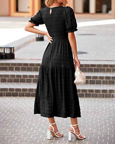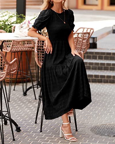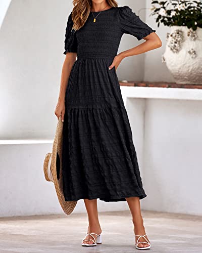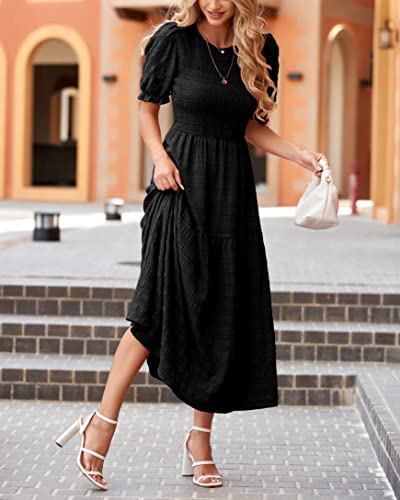 dowerme Womens Summer Dresses 2025 Casual Puff Short Sleeve Crewneck Smocked Flowy Ruffle Boho Beach Party Maxi Sundress