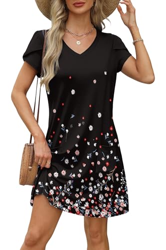 OFEEFAN Womens Summer Dresses 2025 Tulip Petal Short Sleeve V Neck Loose Swing Sundresses with Pockets Plain/Print