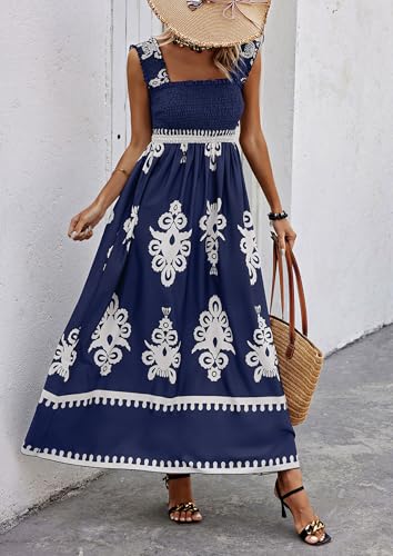 PRETTYGARDEN Womens Summer Boho Maxi Dress 2025 Casual Sleeveless Square Neck Floral Aline Smocked Beach Dresses with Pockets